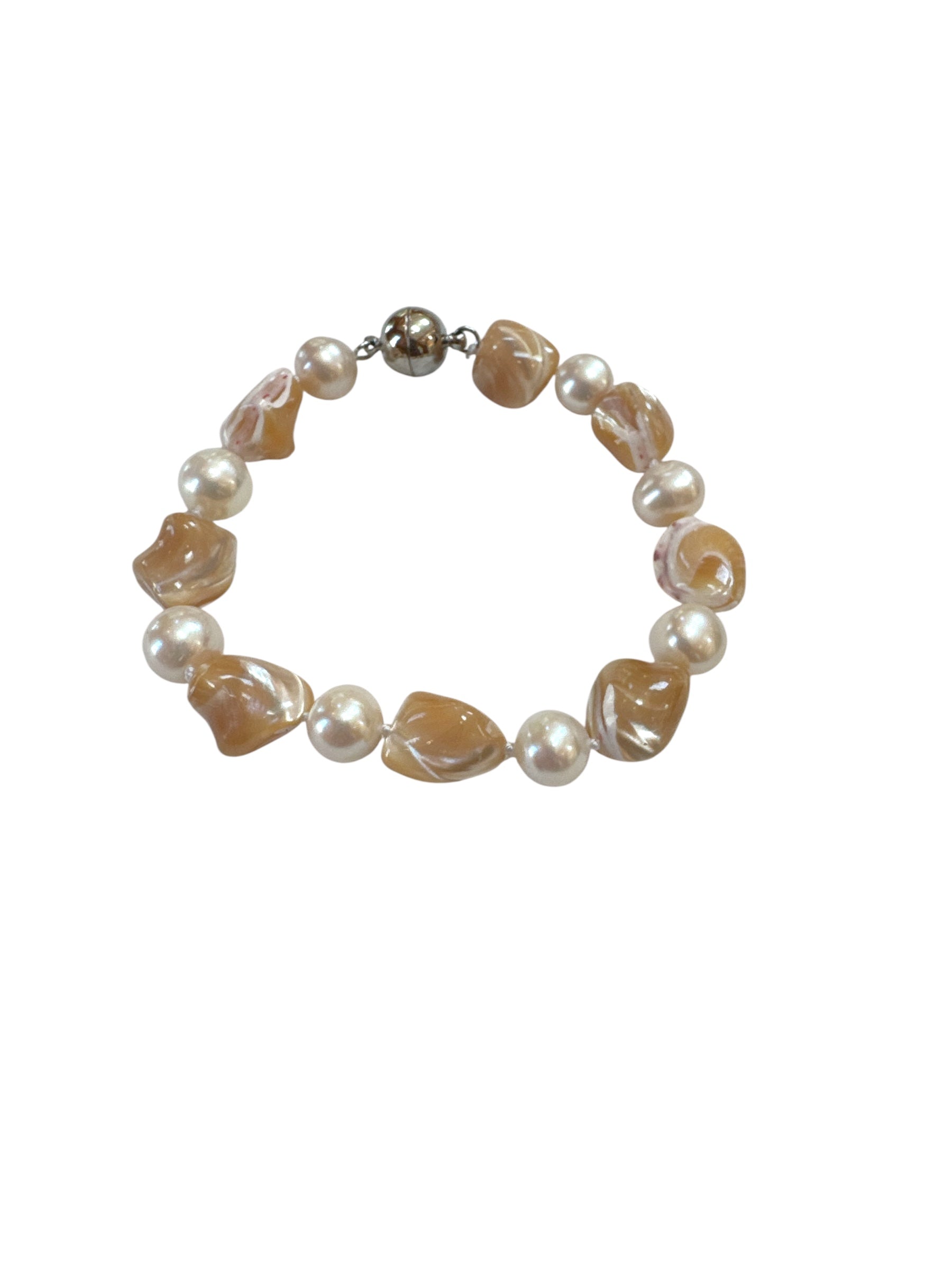 This elegant bracelet features natural shell and freshwater pearls, expertly strung to highlight their unique luster. Measuring 8 inches in length, it secures comfortably with a reliable magnet clasp, combining ease of wear with refined style. Ideal for those seeking a sophisticated accessory that showcases authentic materials with timeless appeal.